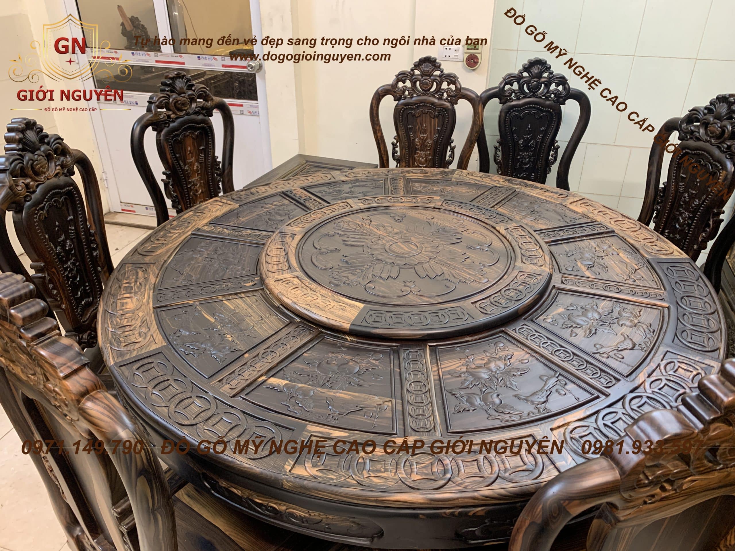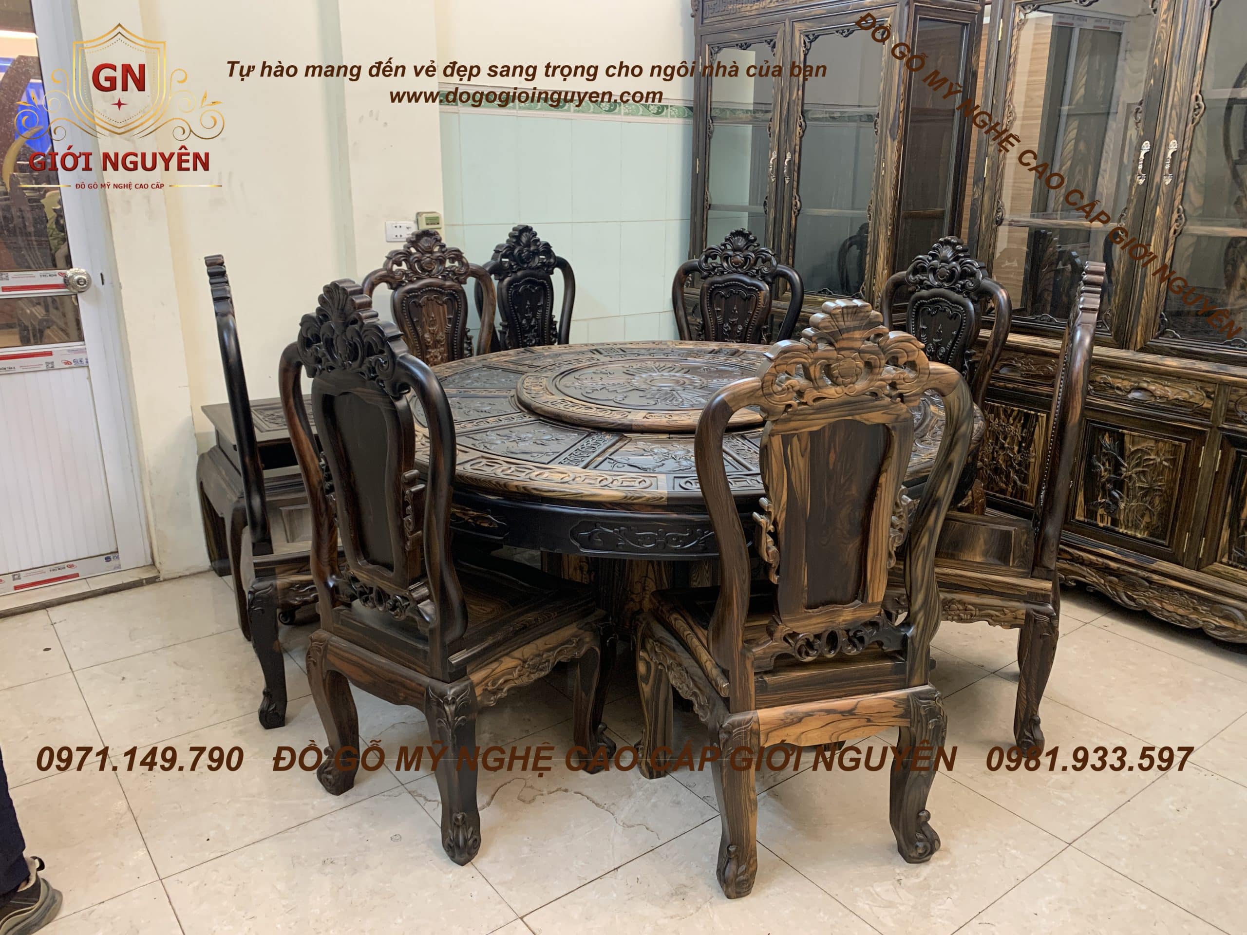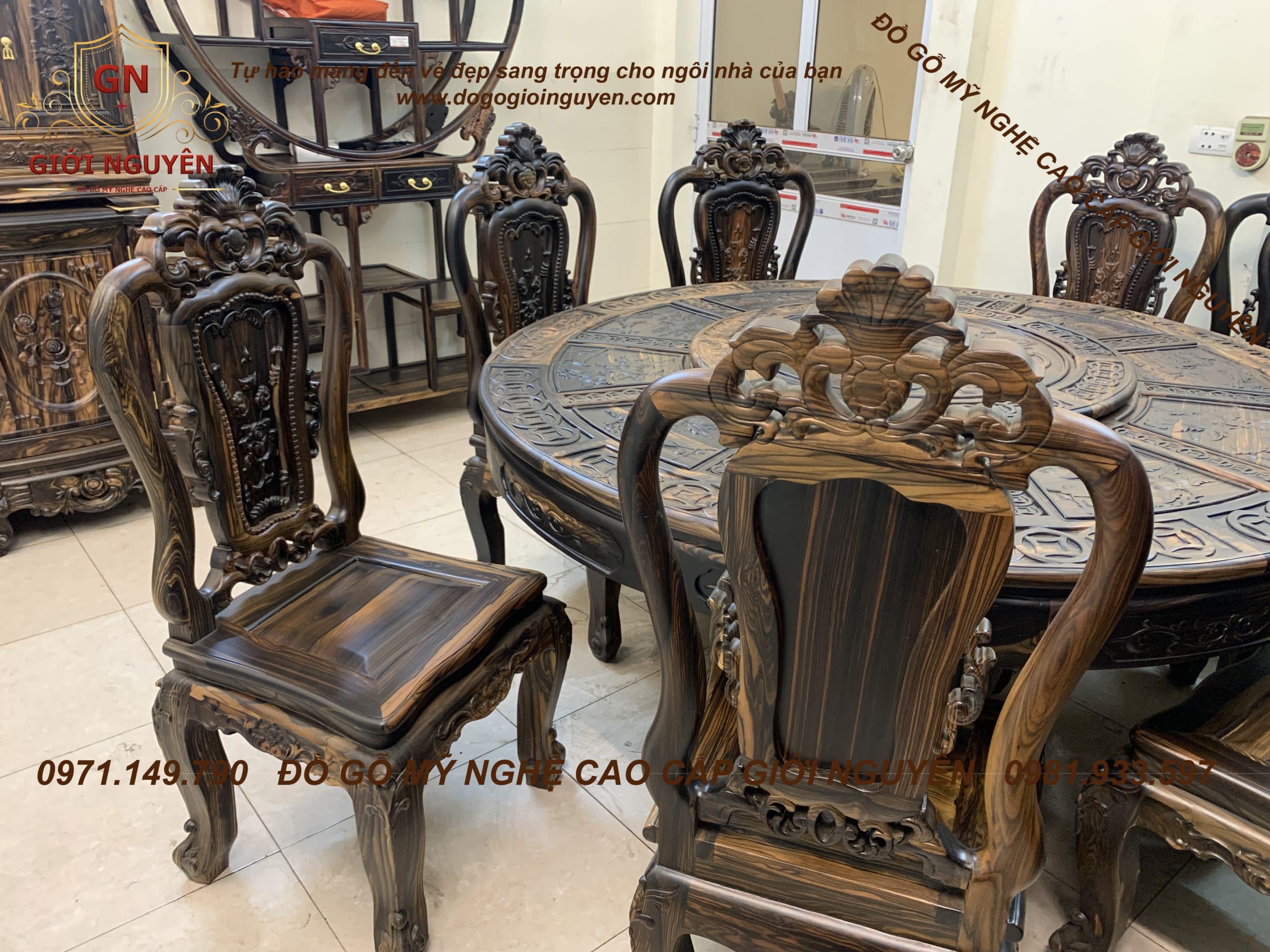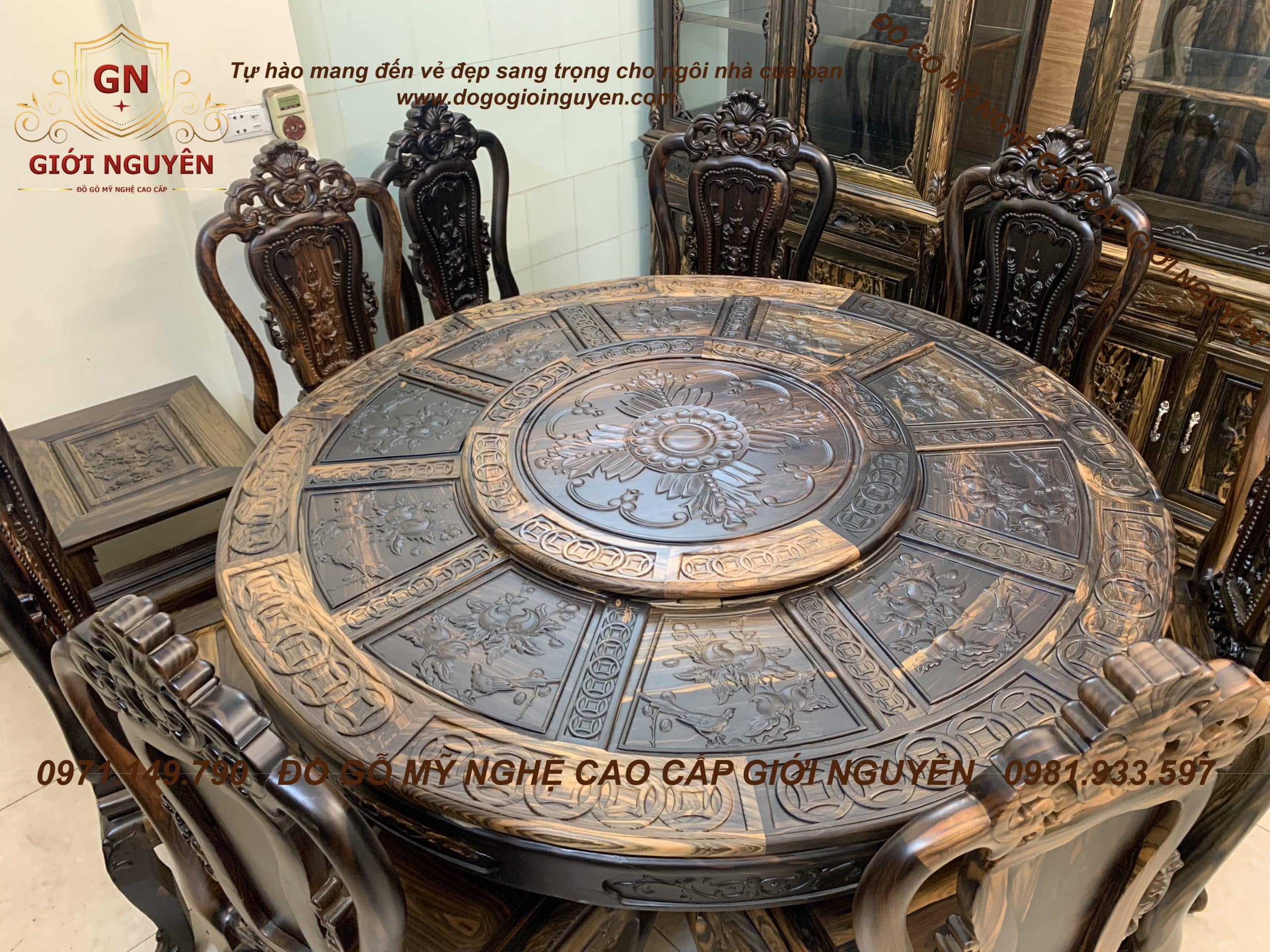 Bộ bàn ghế ăn hoàng gia – Bàn tròn mâm xoay – gỗ mun hoa