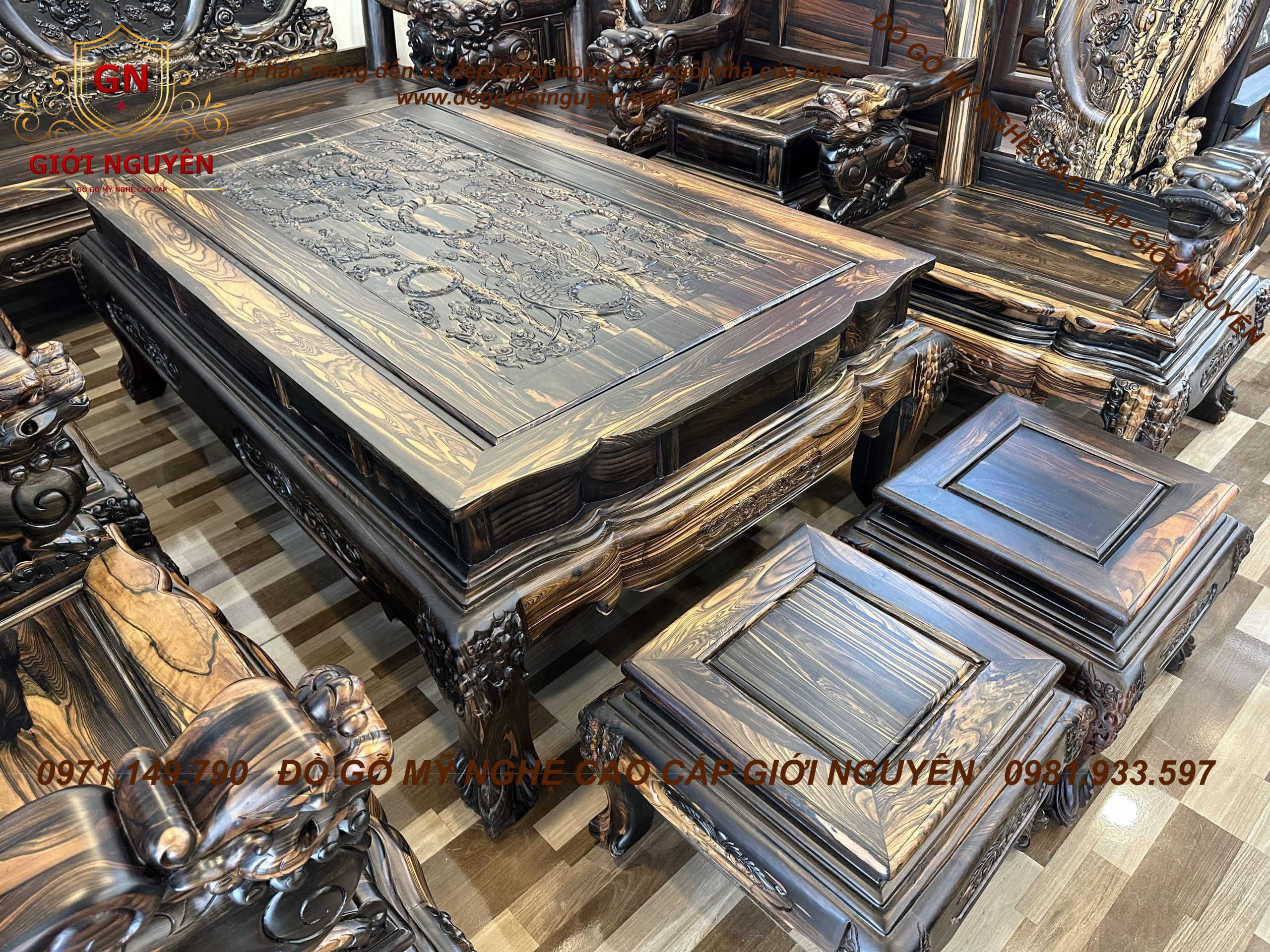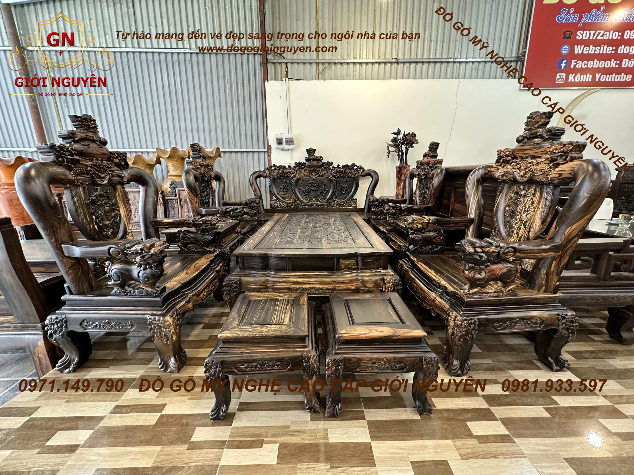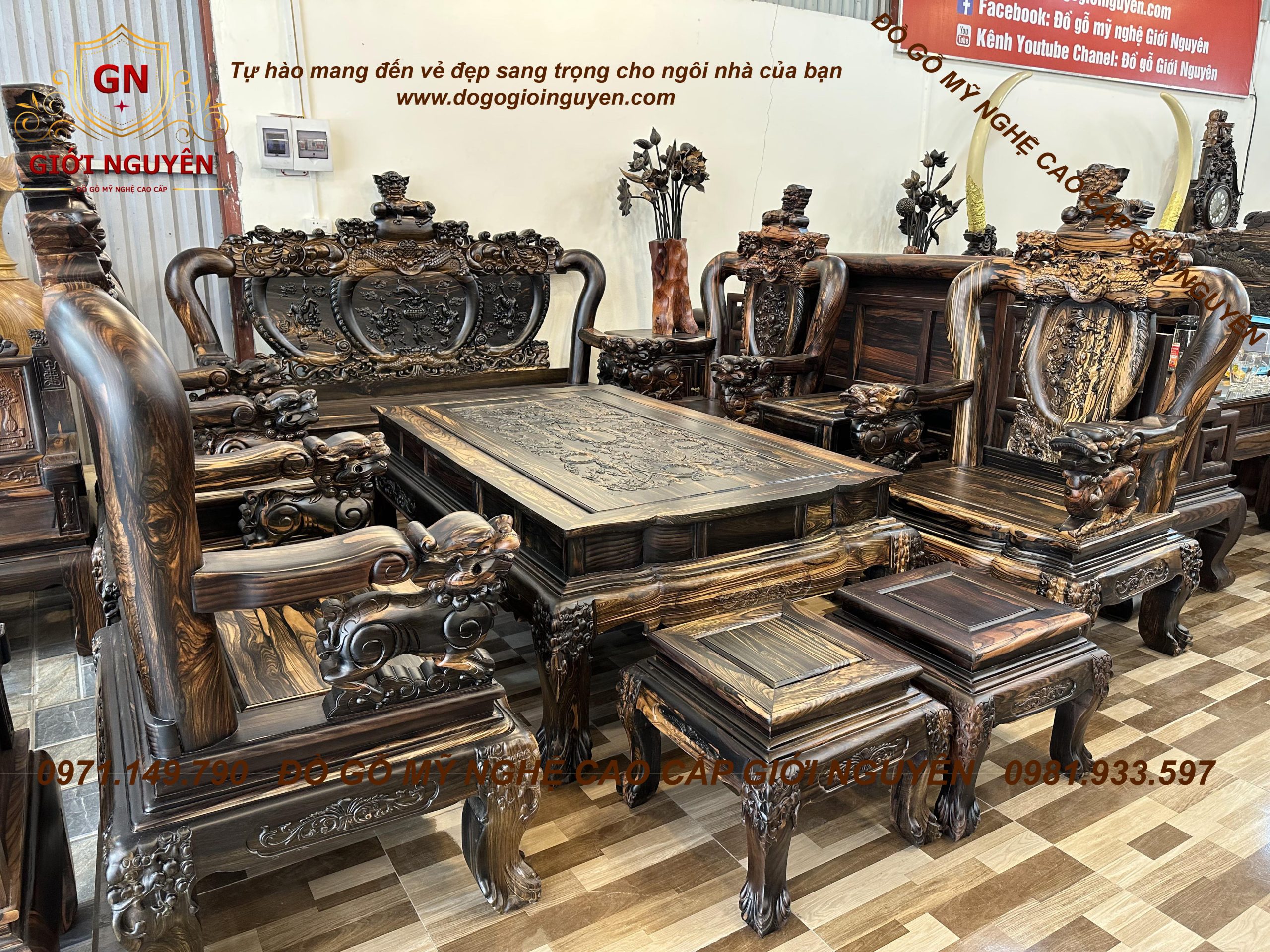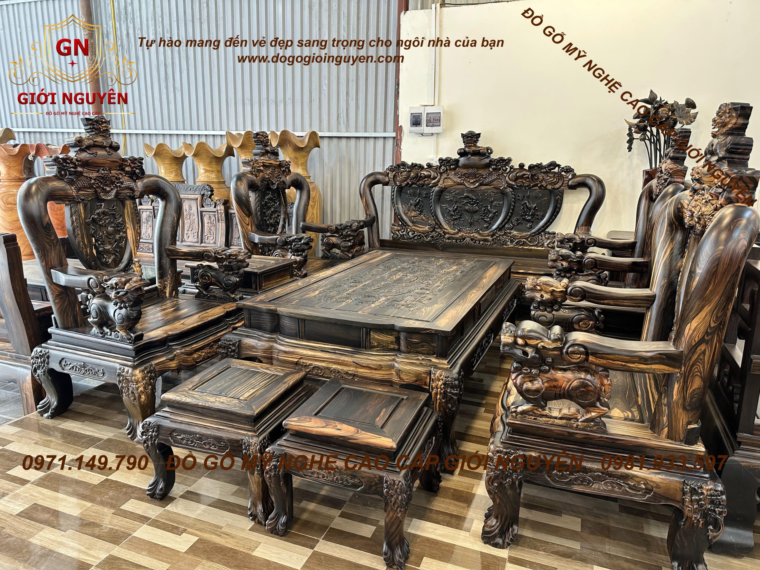 Bộ bàn ghế nghê bảo đỉnh tay 12 gỗ mun hoa 10 món