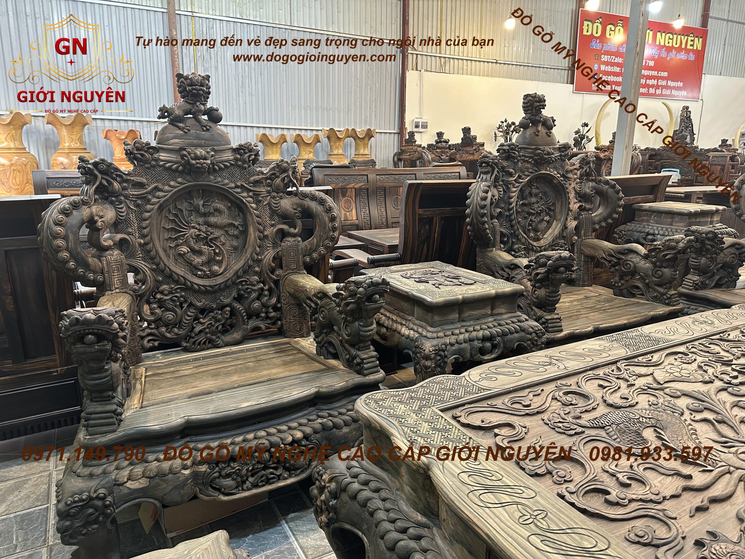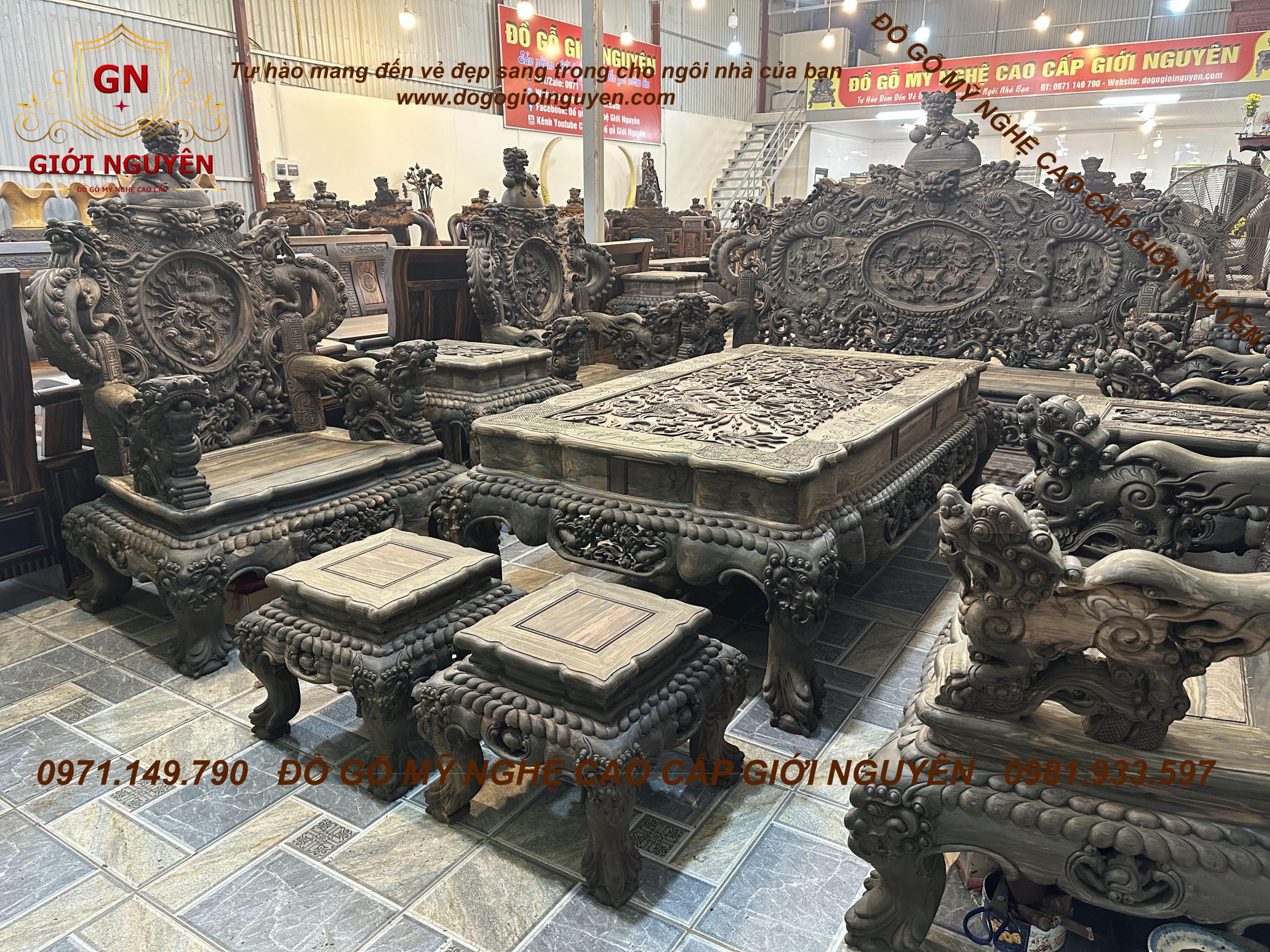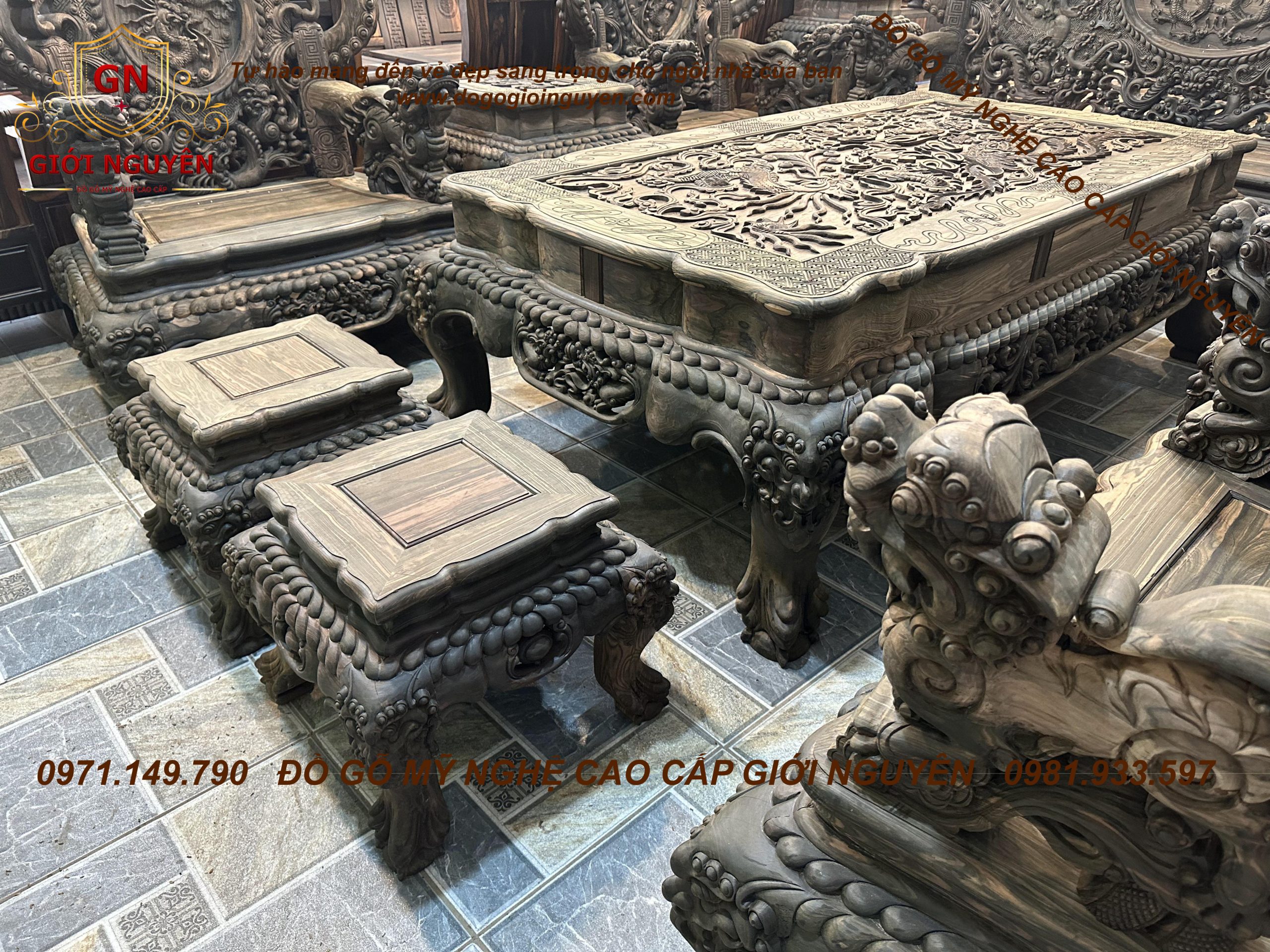 Bộ bàn ghế rồng đỉnh gỗ mun hoa