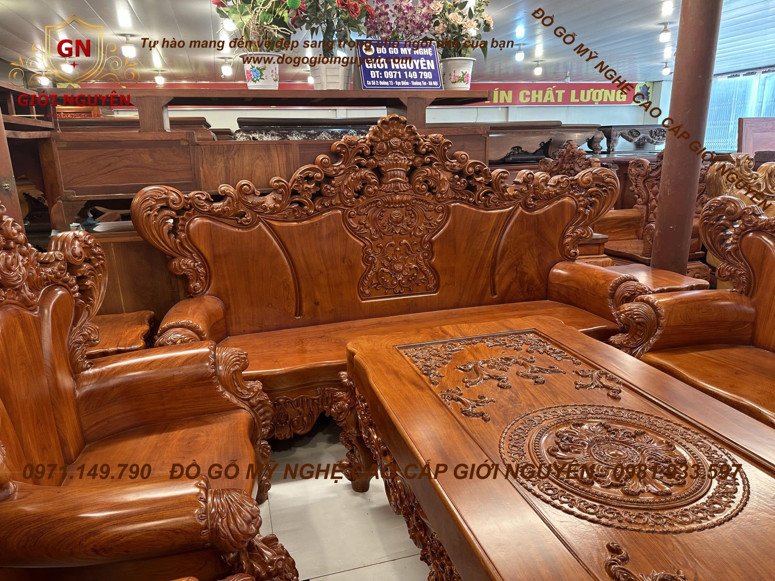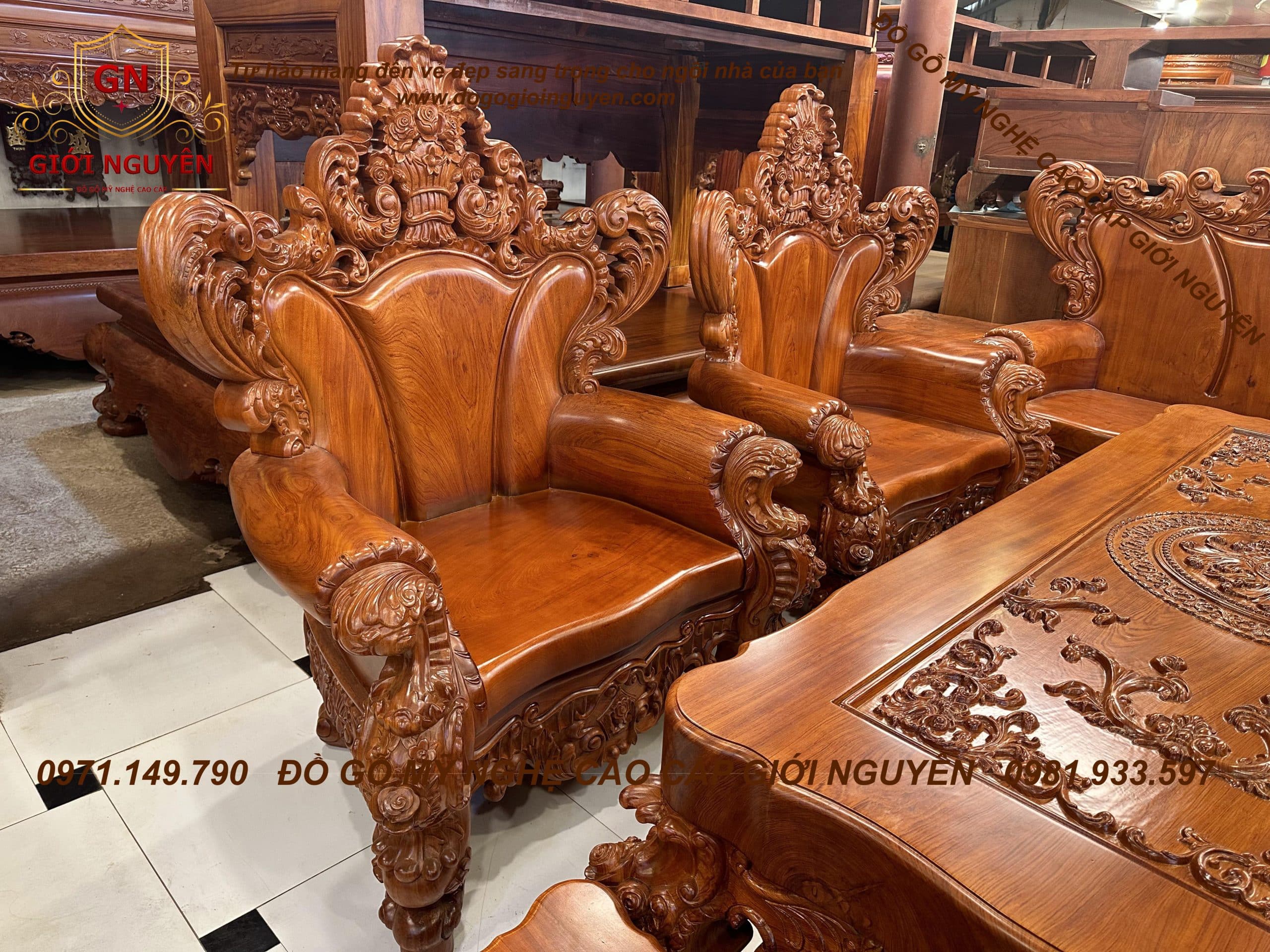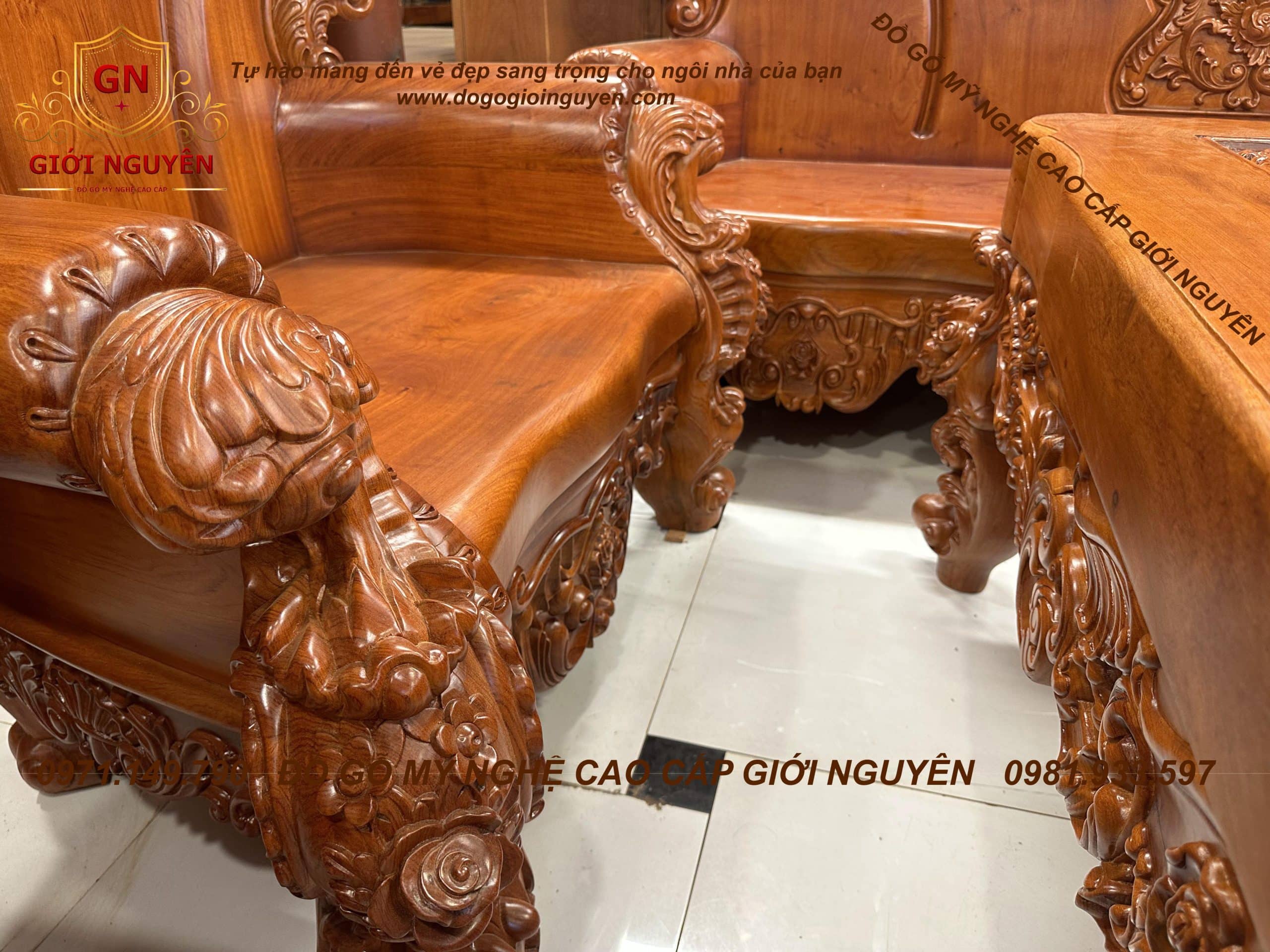 Bộ ghế Hoàng gia tân cổ điển mẫu 3 bông hồng gỗ hương đá