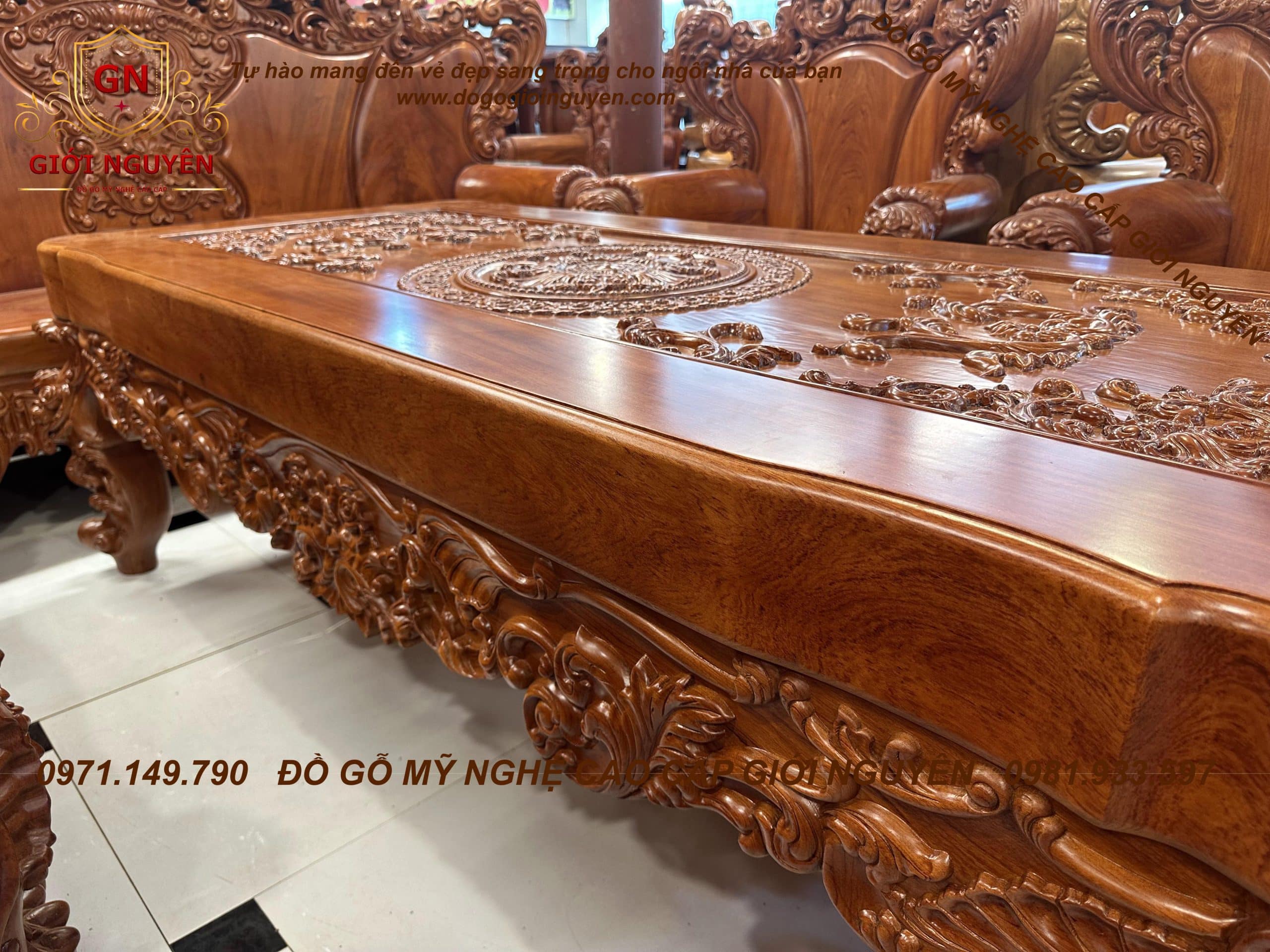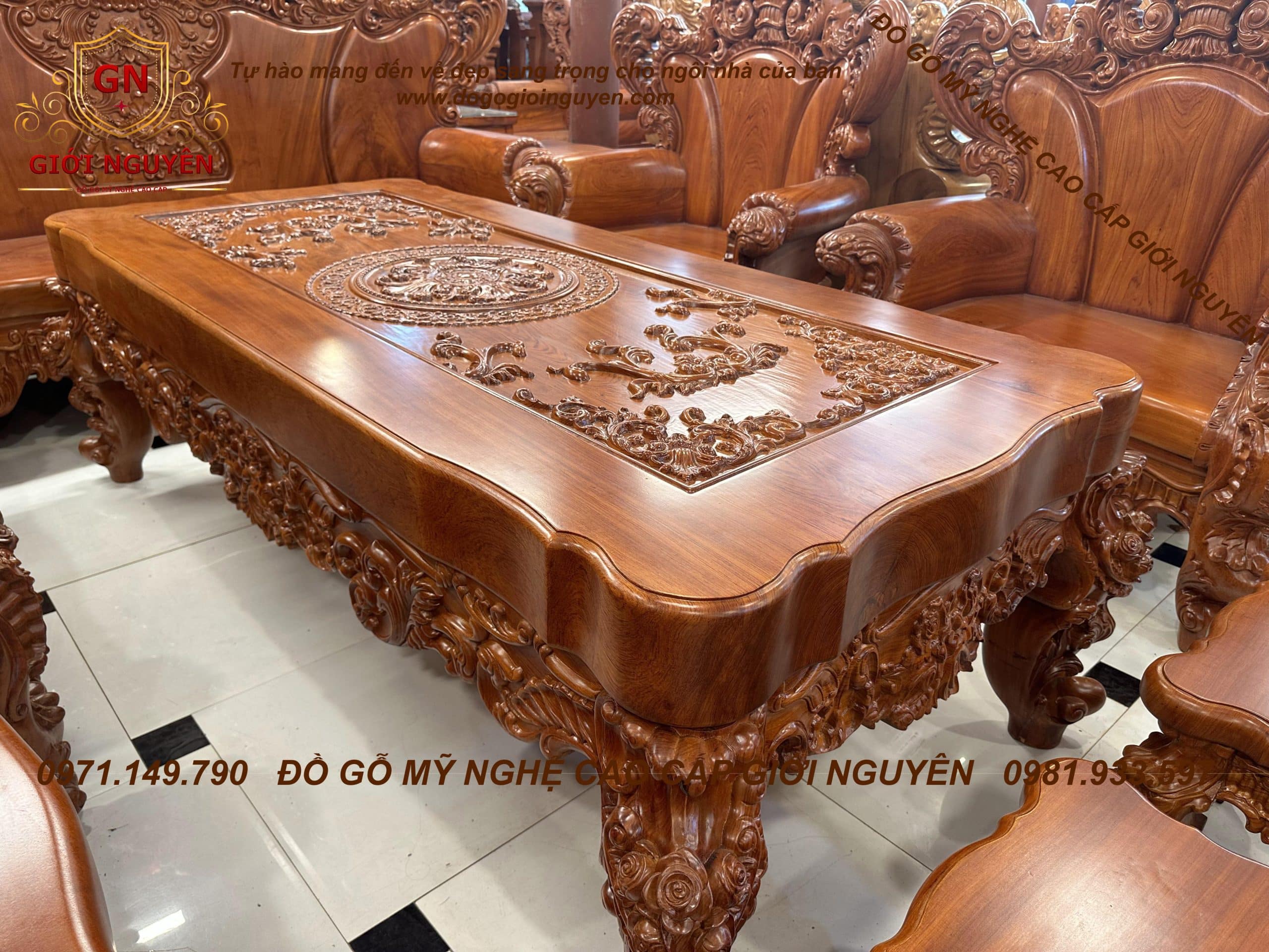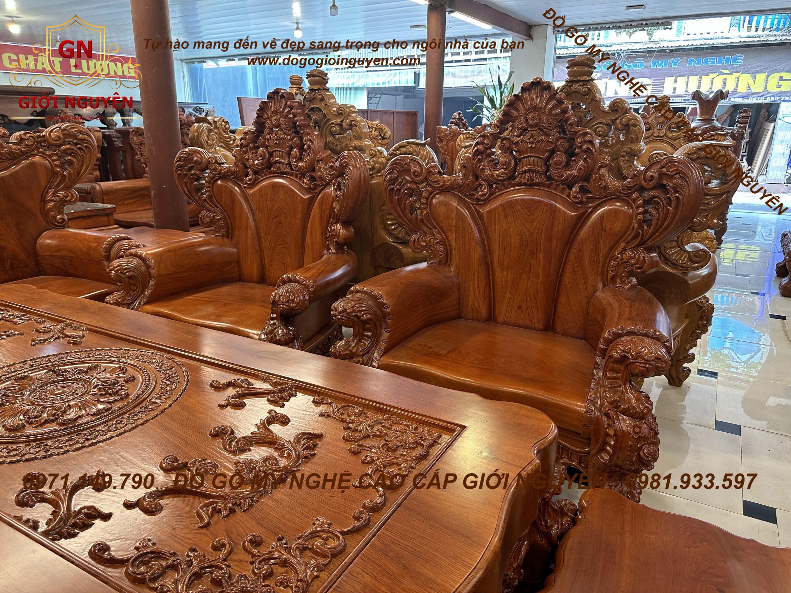 Bộ ghế Hoàng gia tân cổ điển mẫu 3 bông hồng gỗ hương đá