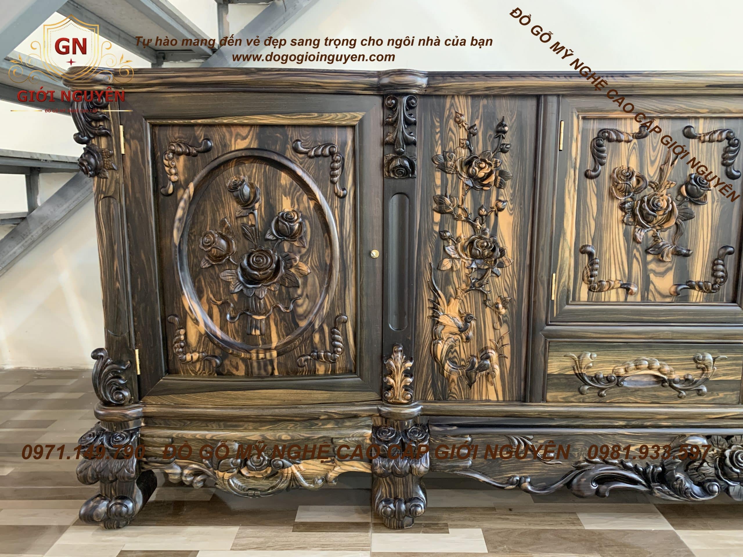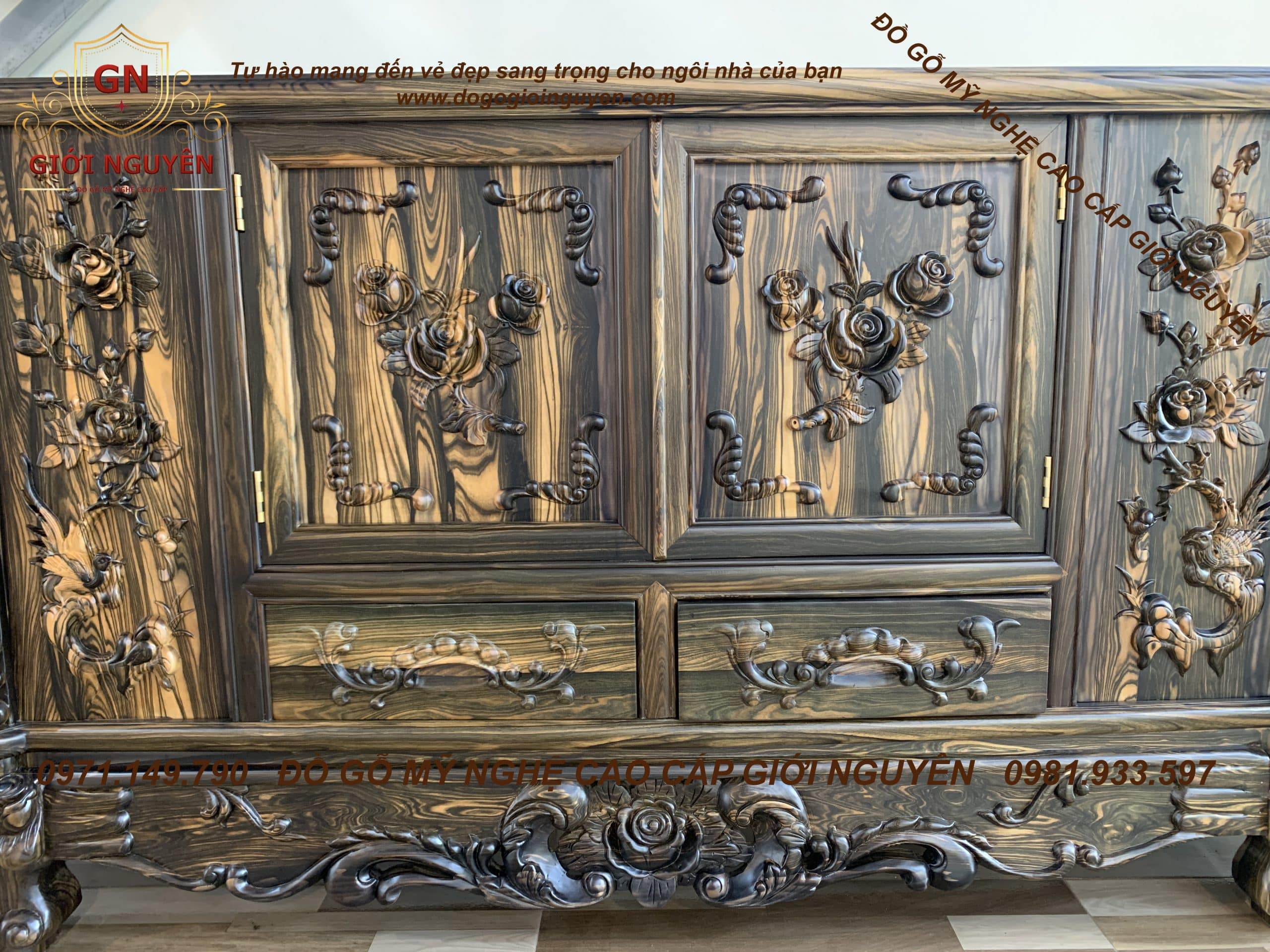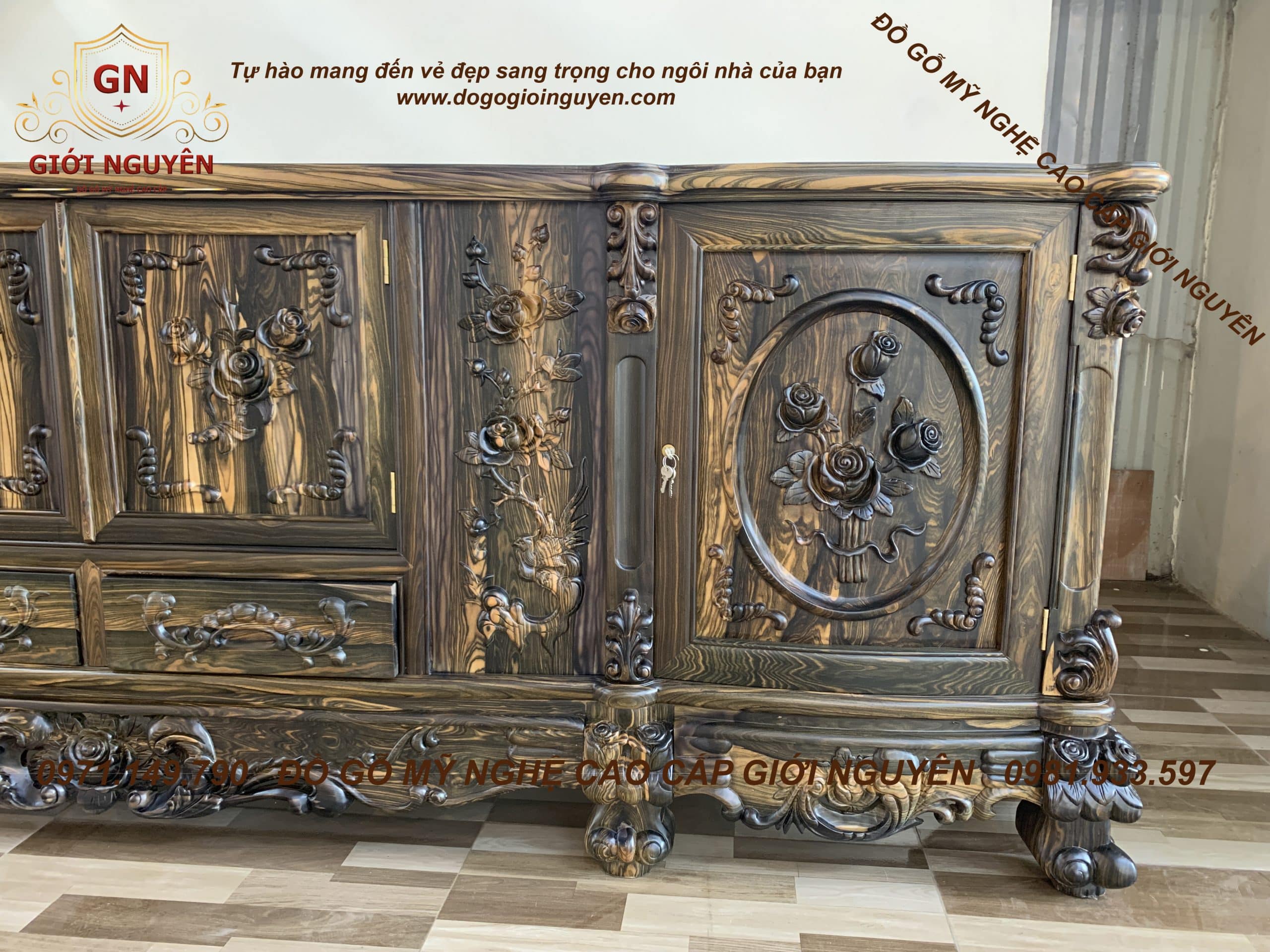 Kệ tivi Hoa Hồng gỗ Mun hoa mẫu mới nhất